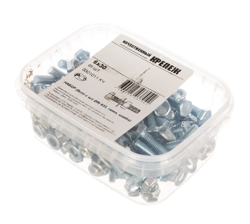 Болт с шайбой и гайкой DIN933 M6х30 (65шт) 0301011 КЧ