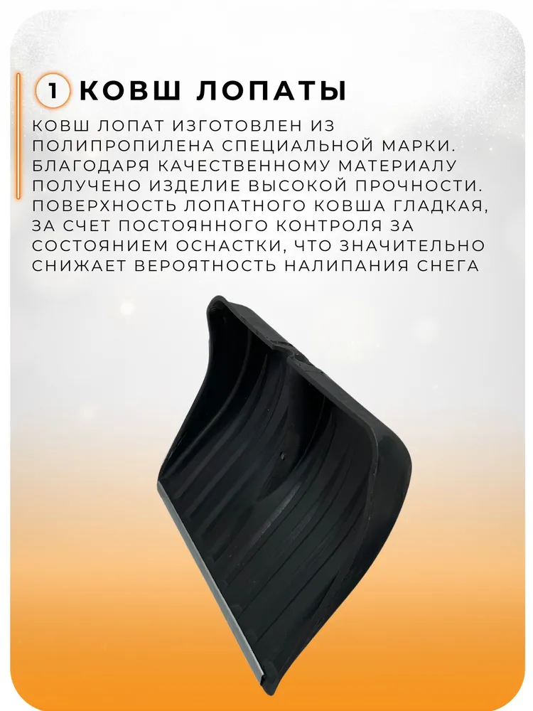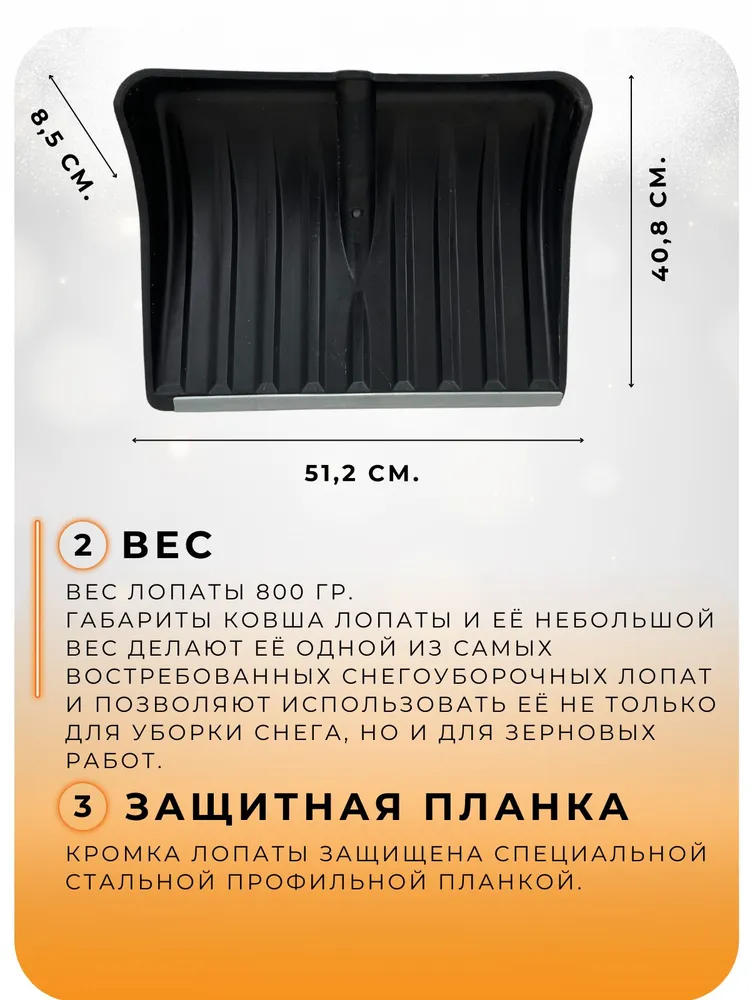 Лопата пластиковая снеговая с оцинкованной планкой без черенка предназначена для очистки ровного дорожного покрытия или прилегающих территорий от снежной массы. Морозоустойчивый и прочный ковш предназначен для быстрой очистки территории от снежных заносов. Снеговая лопата подходит для уборки снега на улице в любых температурных условиях. Оптимальные длина и ширина ковша позволяют легко расчищать широкие дорожки без лишних усилий. Снегоуборочная лопата изготовлена из прочного пластика, устойчивого к низким температурам и снабжена ребрами жесткости для увеличения прочности.