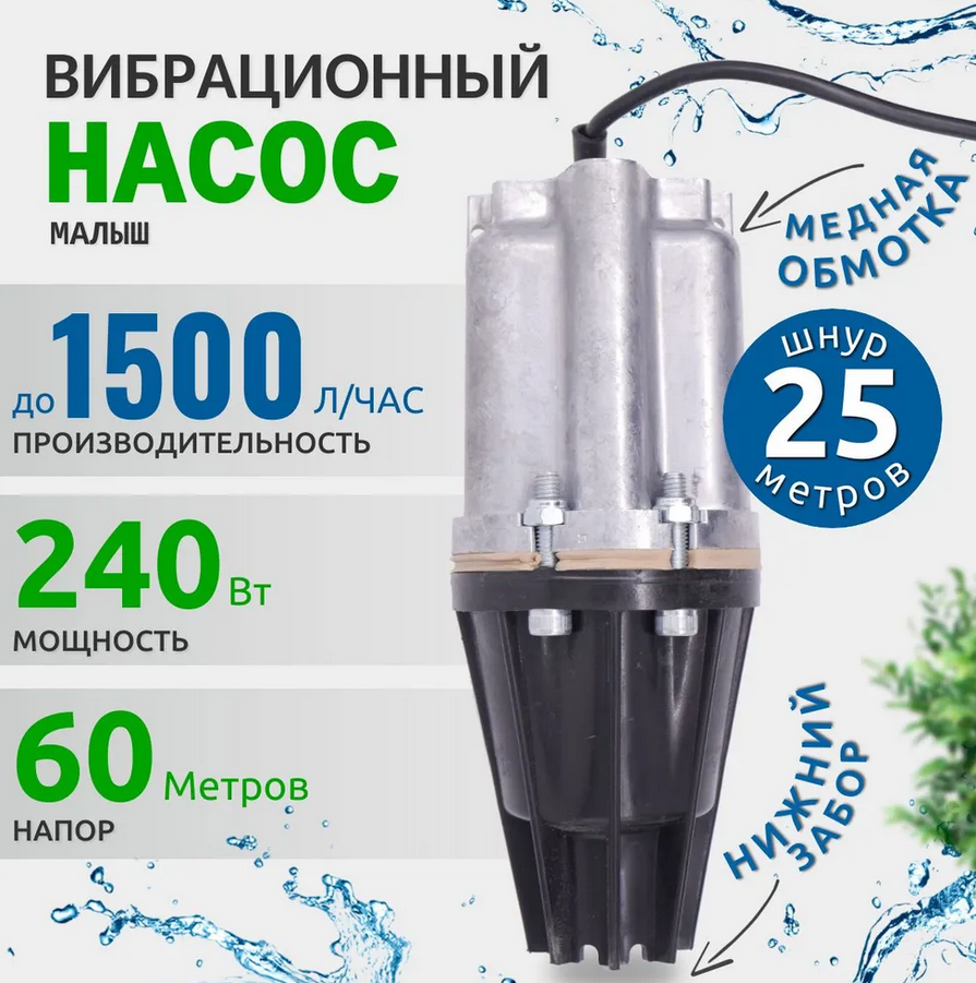 Насос вибрационный "МАЛЫШ" шнур 25 м нижний забор 220 Вт (произ-во з.Ливгидромаш Россия) /248/