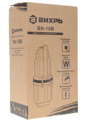 Вибрационный насос Вихрь ВН-10В предназначен для подачи воды в бытовых условиях из скважин внутренним диаметром от 85 мм и более, может использоваться также для подачи воды из шахтных колодцев, резервуаров и открытых водоемов для полива садов и огородов. Насос способен подавать воду из водоемов, расположенных на значительном расстоянии от мест использования воды, горизонтально свыше 100 метров.