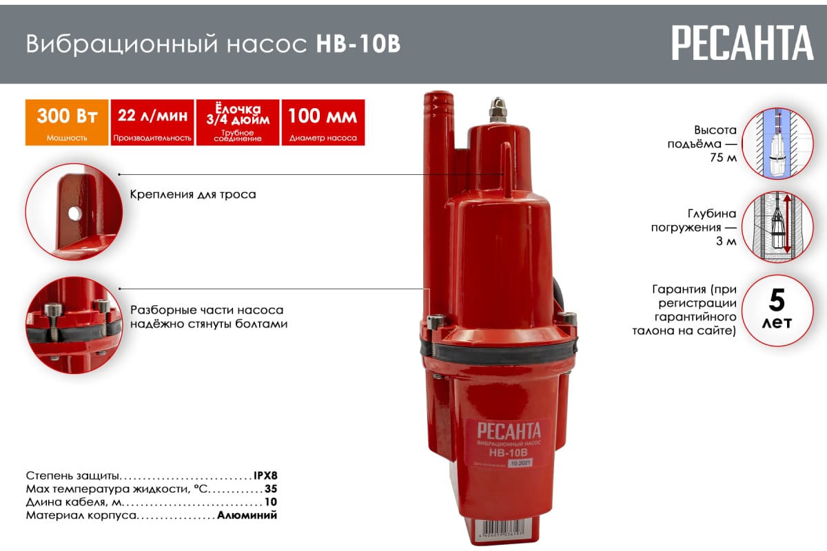 Вибрационный насос Ресанта НВ-10В 77/8/1 предназначен для подачи воды в бытовых условиях из скважин, может использоваться также для подачи воды из шахтных колодцев, резервуаров и открытых водоемов для полива садов и огородов.