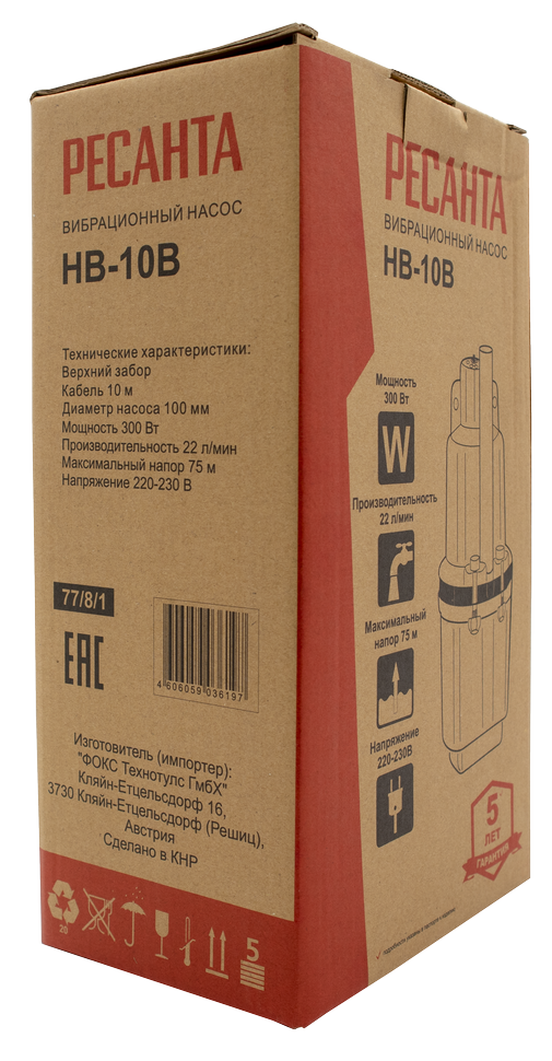 Насос вибрационный "Ресанта" шнур 10 м верхний забор 300 Вт НВ-10В 77/8/1