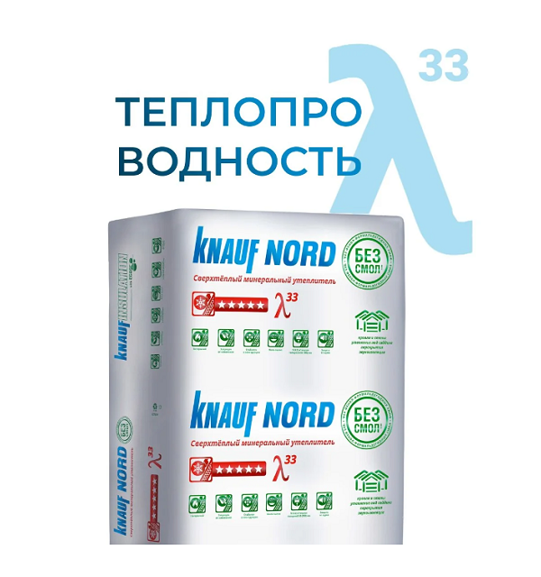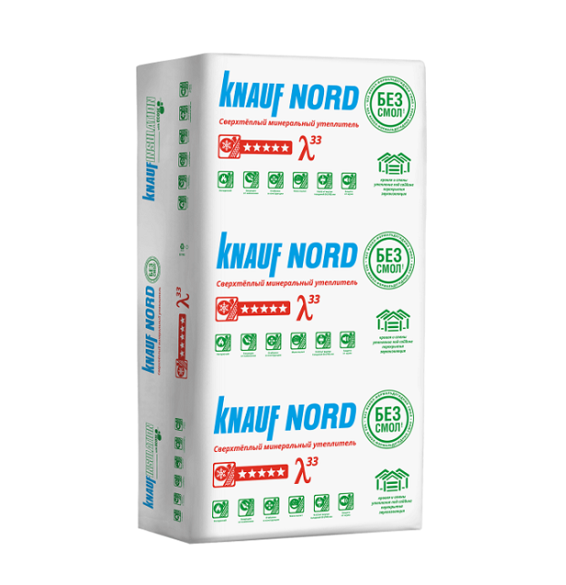 Минераловатные плиты KNAUF Норд из штапельного стекловолокна марки TS 033 отлично подходят для тепло- и звукоизоляции помещений. Это легкий и удобный в работе материал, изготовленный с применением новой технологии производства упругого волокна Fine Fiber и способом производства в один слой (mono layer).