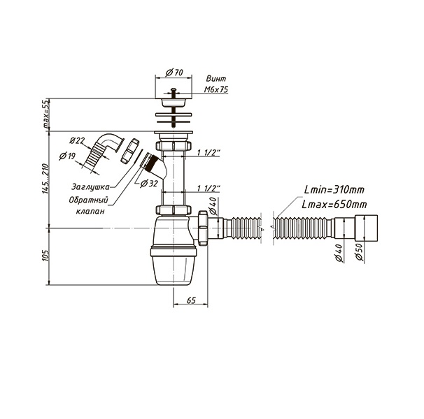 В комплекте идёт полированная нержавеющая чашка д.70мм. Сифон комплектуется нержавеющим винтом длиной 75мм и нержавеющей гайкой М6. Гибкий отвод позволяет подключить слив сифона к канализации с диаметрами 40 или 50мм. Отвод для подключения стиральной/посудомоечной машины имеет два диаметра подключения 19 и 22мм. Так же имеется заглушка отвода подключения бытовой техники, на случай её не использования.