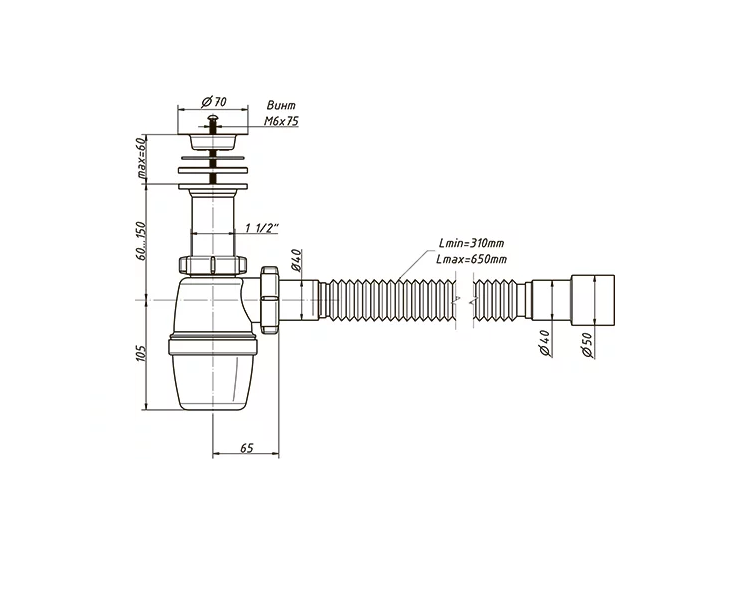В комплекте идёт полированная нержавеющая чашка д.70мм. Сифон комплектуется нержавеющим винтом длиной 75мм и нержавеющей гайкой М6, которая уже вставлена в корпус литого выпуска для удобства установки. Гибкий отвод позволяет подключить слив сифона к канализации с диаметрами 40 или 50мм.