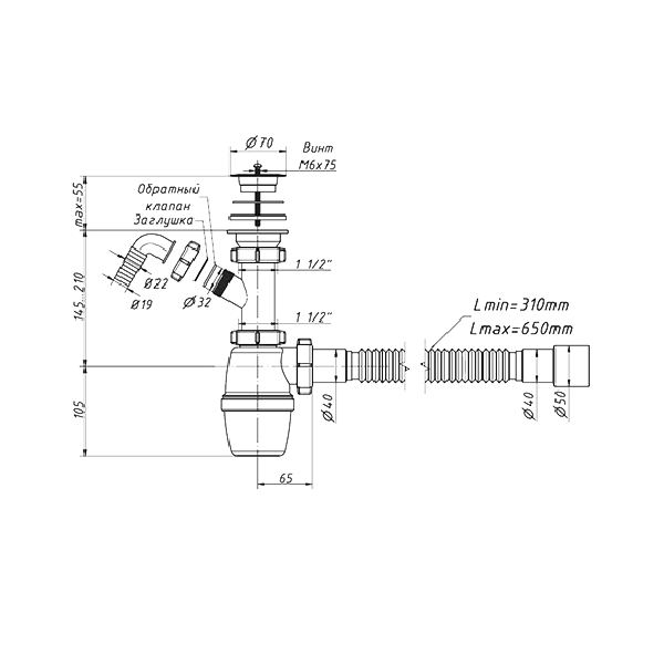 В комплекте идёт пластиковая чашка д.70мм. Сифон комплектуется нержавеющим винтом длиной 75мм и нержавеющей гайкой М6. Гибкий отвод позволяет подключить слив сифона к канализации с диаметрами 40 или 50мм. Отвод для подключения стиральной/посудомоечной машины имеет два диаметра подключения 19 и 22мм. Так же имеется заглушка отвода подключения бытовой техники, на случай его не использования.