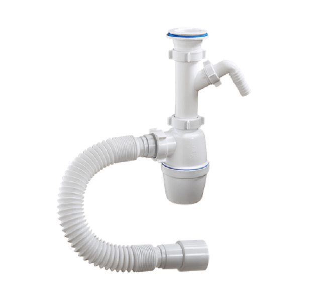 Сифон с большим корпусом и отстойником, выпуском с пластиковой решеткой д.70мм, отводом для слива от стиральной или посудомоечной машины и гибкой трубой 40 -40/50 в комплекте для мойки.