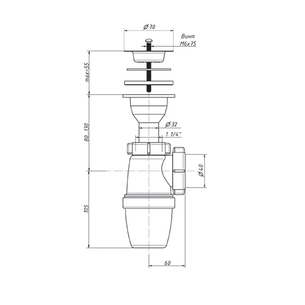В комплекте идёт полированная нержавеющая чашка д.70мм. Сифон комплектуется нержавеющим винтом длиной 75мм и нержавеющей гайкой. Конструкция выпуска литая. Без отвода в канализацию.