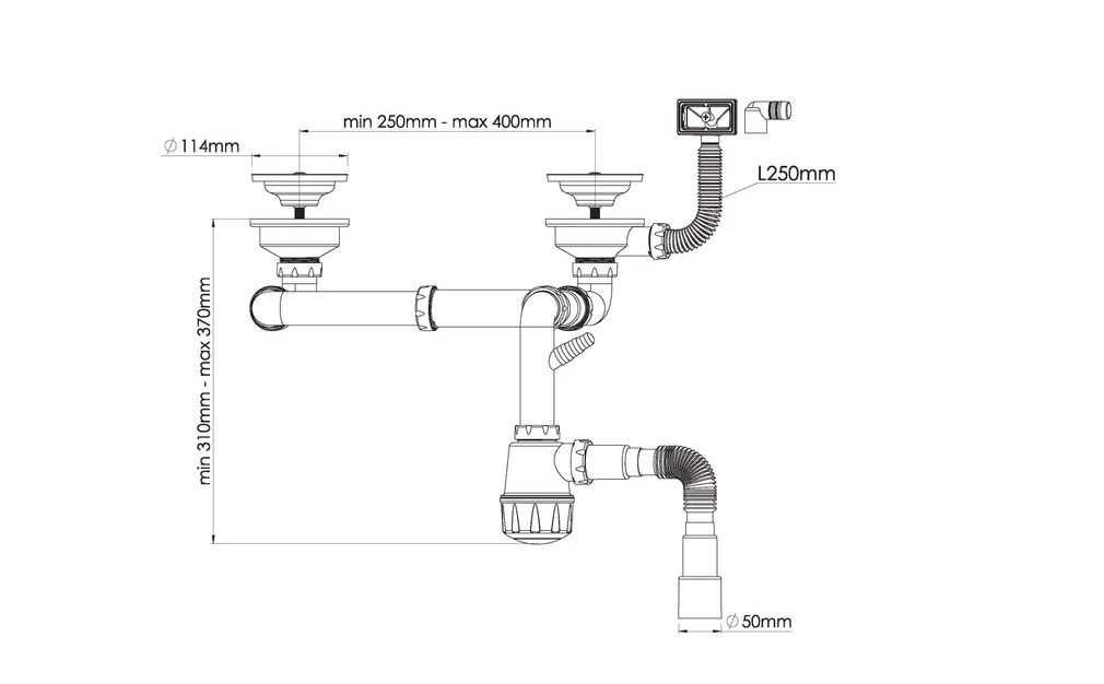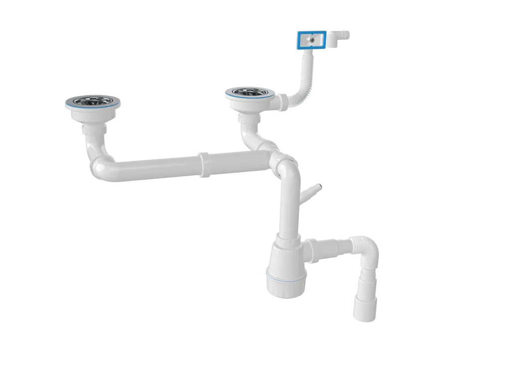 Сифон для мойки двойной с выпусками 3 1/2 разноуровневый, с переливом, с отводом для стиральной машины, большая колба, латунные винты 25мм, выход гибкая труба 40/50мм. Изготовлено из первичного сырья. Выпуск из нержавеющей стали. Универсальный выход в канализацию d 40/50