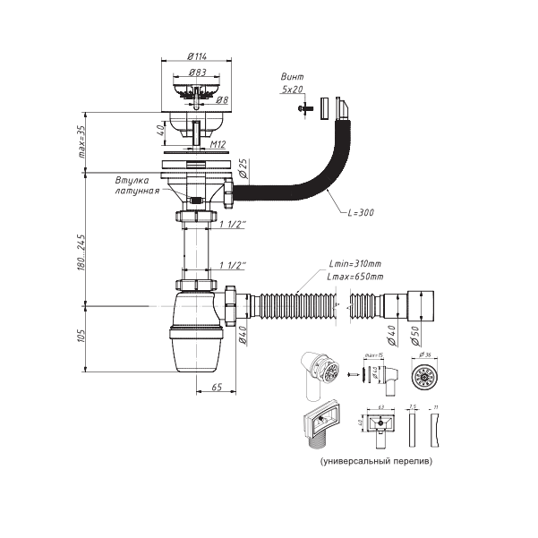 Сифон для мойки ОРИО бутылочный 3 1/2х40мм с универсальным переливом А-45079