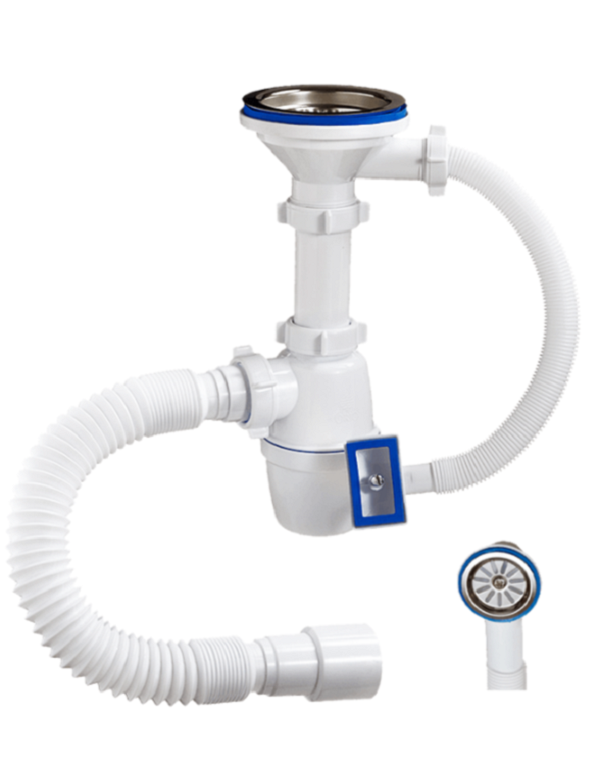 Сифон с большим корпусом и отстойником, выпуском с нержавеющей чашкой д.114мм для кухонных моек с прямоугольным или круглым переливом. В комплекте есть отвод в канализацию гибкая труба 40-40/50мм.