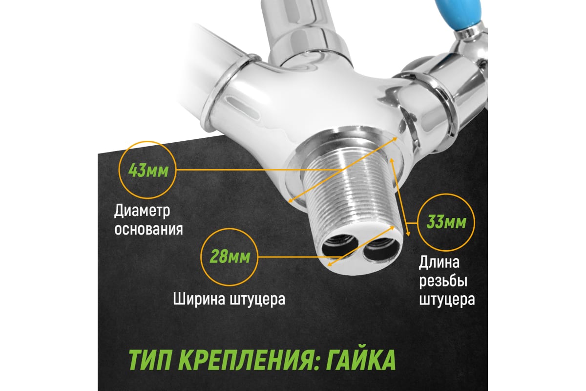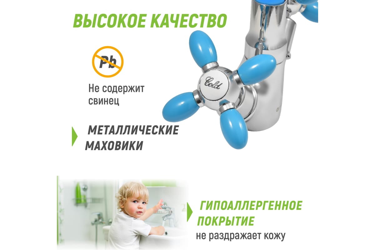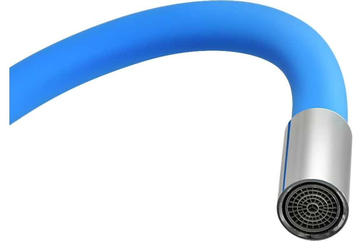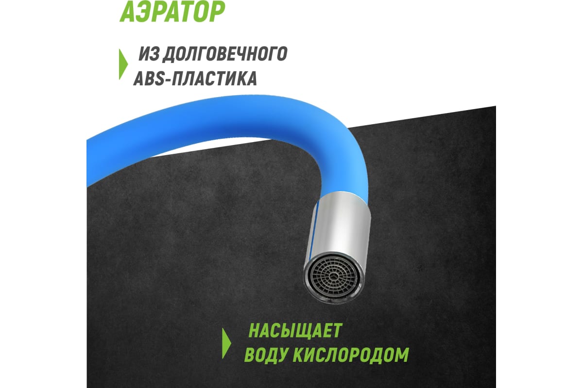 Кран для кухни имеет гибкий синий силиконовый высокий излив (гусак), у него есть аэратор для смесителя - насадка на кран для экономии воды, 2 режима (обычный и ополаскивание).