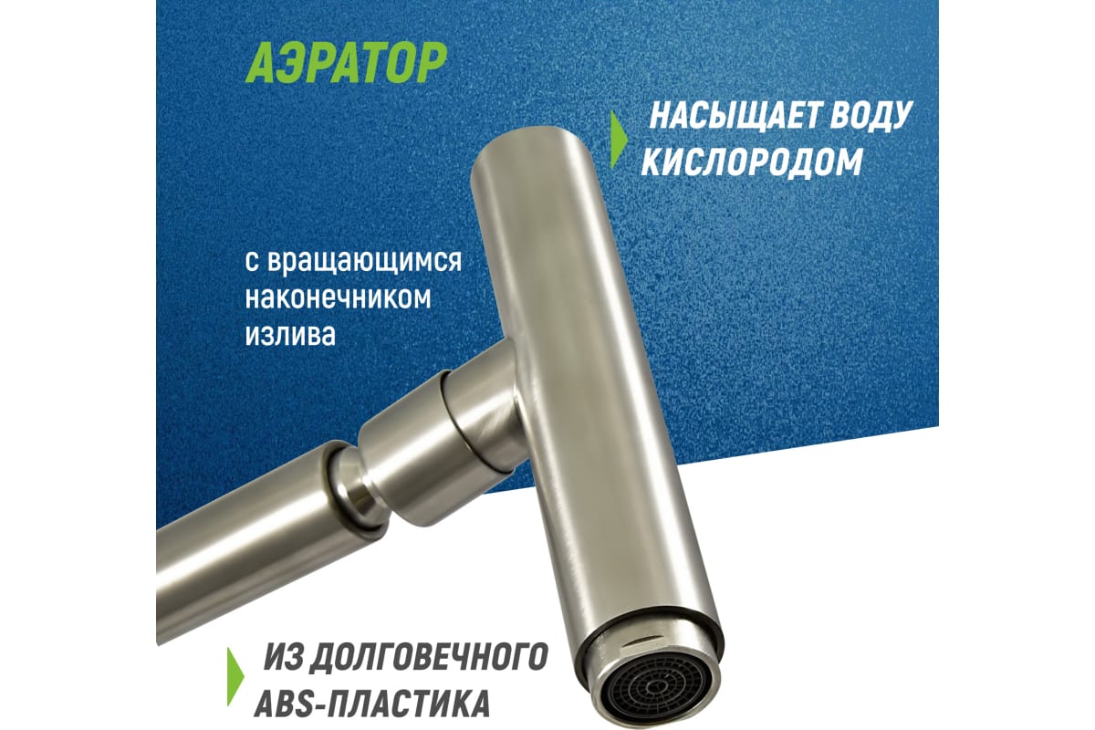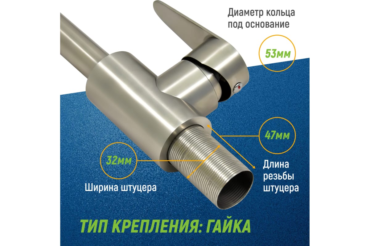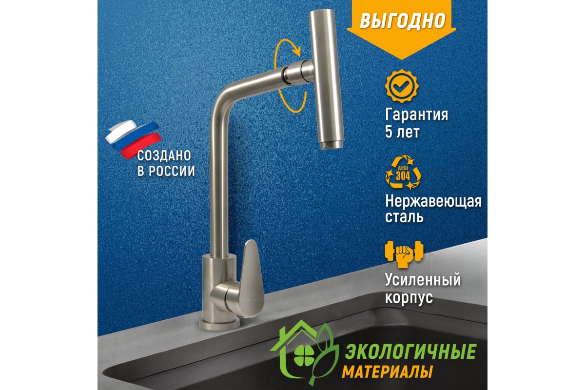 Назначение смесителя: для мойки. Материал корпуса: нержавеющая сталь AISI 304. Цвет: сатин (нержавеющая сталь). Запорный механизм: керамический картридж диаметром 35 мм. Излив: высокий, поворотный, с вращающимся наконечником излива. Длина излива: 210 мм. Высота излива: 225 мм. Диаметр основания смесителя: 45 мм. Кольцо под основание смесителя, мм: 53 х 8. Тип крепления: гайка (длина резьбы штуцера 47 мм, ширина штуцера 32 мм). ДШВ смесителя, мм: 240 х 45 х 380. Рабочая температура: до +80°С. Максимальное давление: 10 бар. Страна производства: Россия. Срок гарантии: 5 лет. Комплектация: смеситель – 1 шт, крепеж – 1 комплект (гайка), гибкая подводка 35 см (пара), паспорт (с гарантийным талоном) – 1 шт. Размер индивидуальной упаковки, см: 38×24×5,5. Кол-во в индивидуальной упаковке: 1 шт. Кол-во в транспортной упаковке: 10 шт. Преимущества: наилучшее соотношение цены и качества; высокая прочность корпуса из нержавеющей стали.