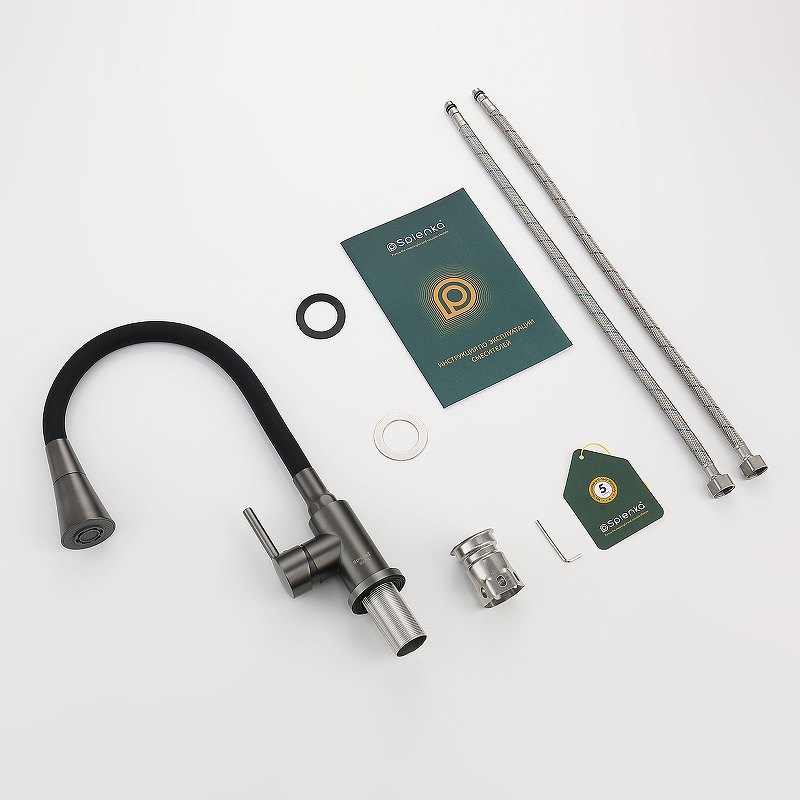 Стильный смеситель для кухни Splenka S201.4306.09 выполнен из нержавеющей стали в цвете графит. Смеситель для кухни с гибким изливом отлично подходит для использования на кухне, а также у него имеется дополнительный кран для подключения питьевой воды. В комплекте идет переходник на систему питьевой воды. Каждый излив оснащен аэратором и однорычажной системой управления подачей воды. В данной модели используется керамический картридж диаметром 35 мм. В комплекте со смесителем есть все необходимое для самостоятельной установки — гибкая подводка длиной 50 см и комплект крепежа.