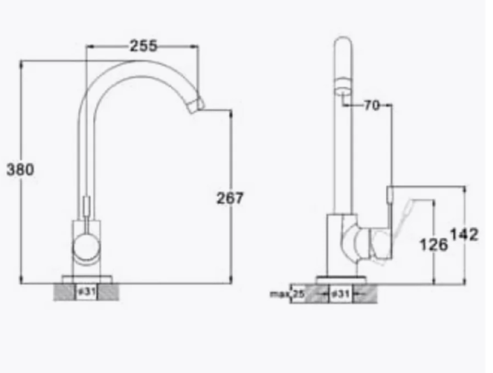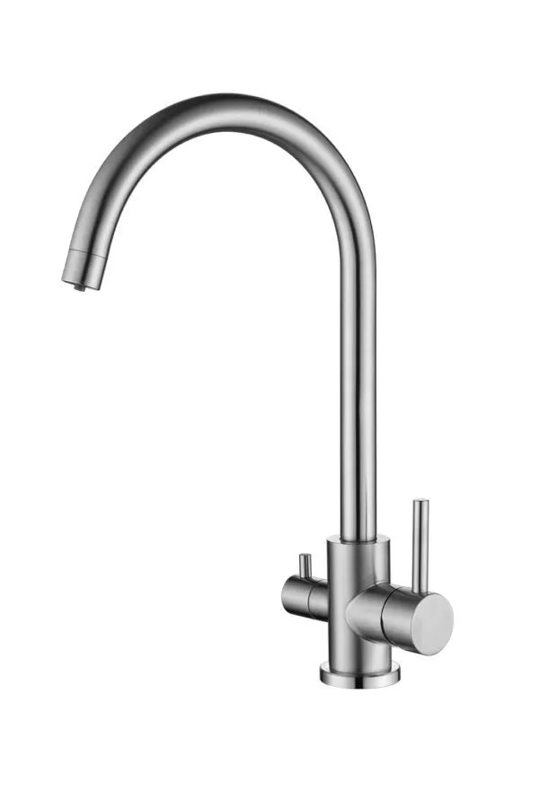 Смеситель для кух. мойки, технология производства токарная обработка, материал корпуса нерж. cталь SUS 304 (пищевая), с пов. С-образным бикональным изливом 360° и подключением к фильтру с питьевой водой, картридж ø35 / ø25, без покрытия, крепление гайка-втулка. Длина подводки 55см. 10шт/уп.