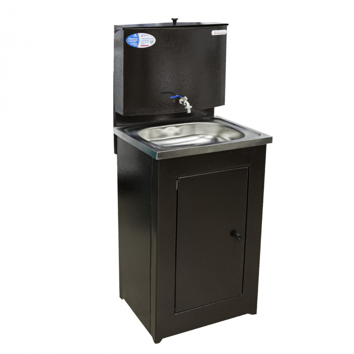 Конструкция умывальника Акватекс составная: включает в себя тумбу, которая аккуратно скрывает способ слива воды и позволяет осуществлять водоотвод в канализацию или отдельную емкость, и бак с металлическим шаровым краном. Емкость бака внутри обработана гальваническим цинковым покрытием, которое обеспечивает долгий срок службы изделия и исключает появление ржавчины (если не будет мех. повреждений).