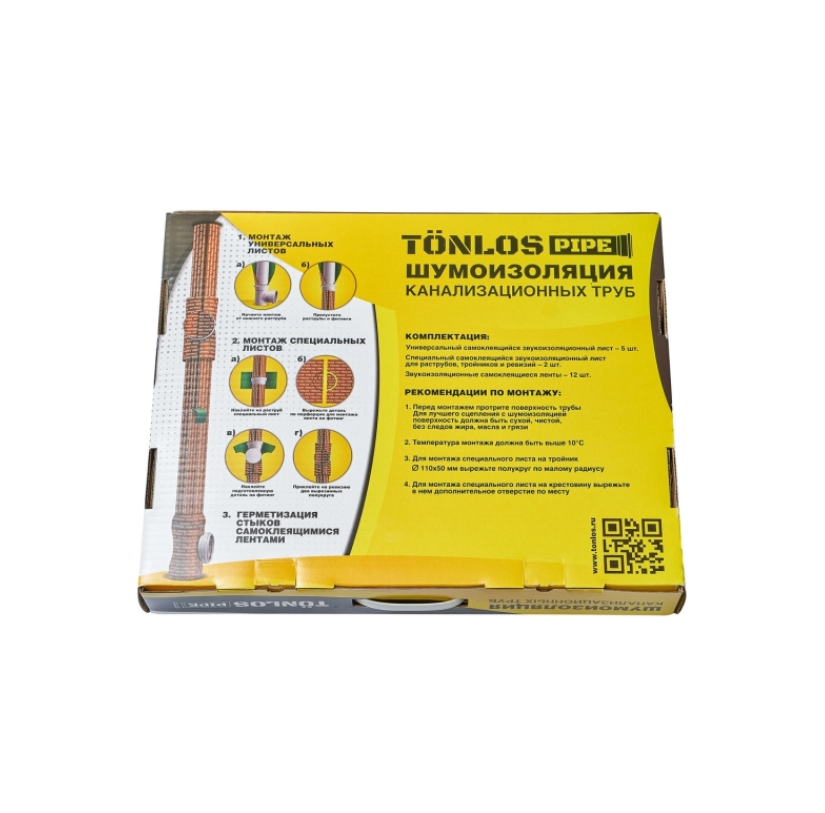 Материал самоклеящийся - при монтаже не нужны стяжки и герметики. Комплект предназначен для труб длиной до 3 м. Листы вырезаны в размер стандартной канализационной трубы диаметром 110 мм и не нуждаются в подгонке. Для раструбов, компенсаторов, тройников, крестовин и ревизий в комплекте есть листы с перфорацией диаметром 110 мм и 50 мм. Их легко подрезать по нанесенной разметке. Для изоляции стыков в наборе предусмотрены самоклеящиеся ленты.