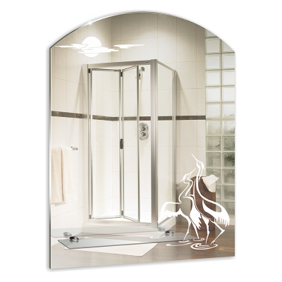 Пескоструйный рисунок добавит зеркалу нотку индивидуальности и неповторимости. На практичной полочке из стекла будет удобно хранить гигиенические средства и мелкие аксессуары.