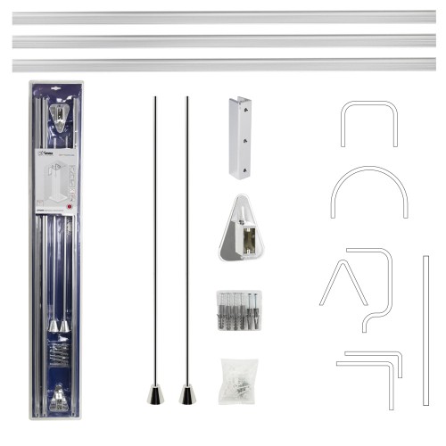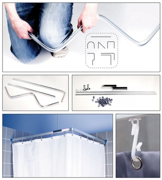 Карниз выполнен из алюминия и предназначен для крепления душевой шторки в ванной комнате. В комплект входят три блока по 100 см, 24 крючка, две штанги для крепления уголков к потолку и шурупы. Карниз гибкий, ему легко придать любую форму руками.