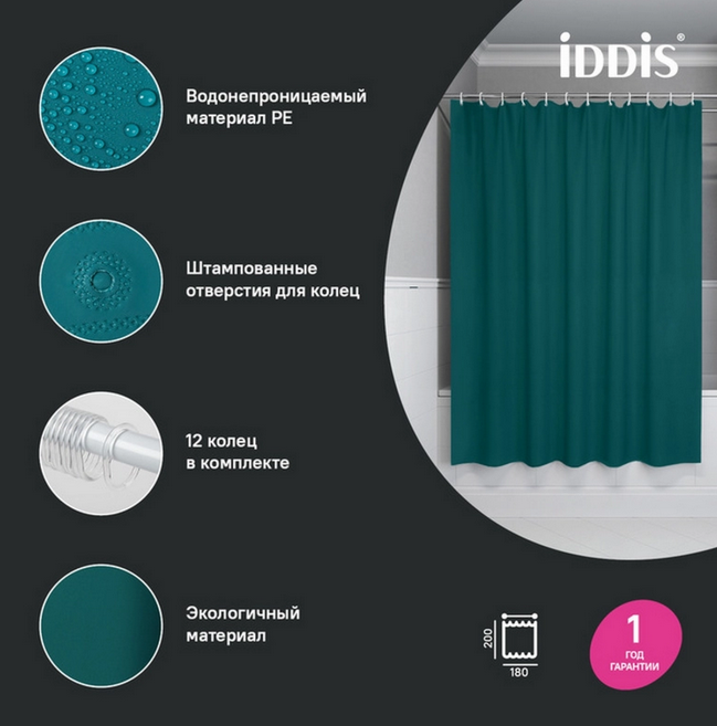 Штора для ванной комнаты IDDIS Promo тёмно-зелёная 180х200 см P04PE18i11