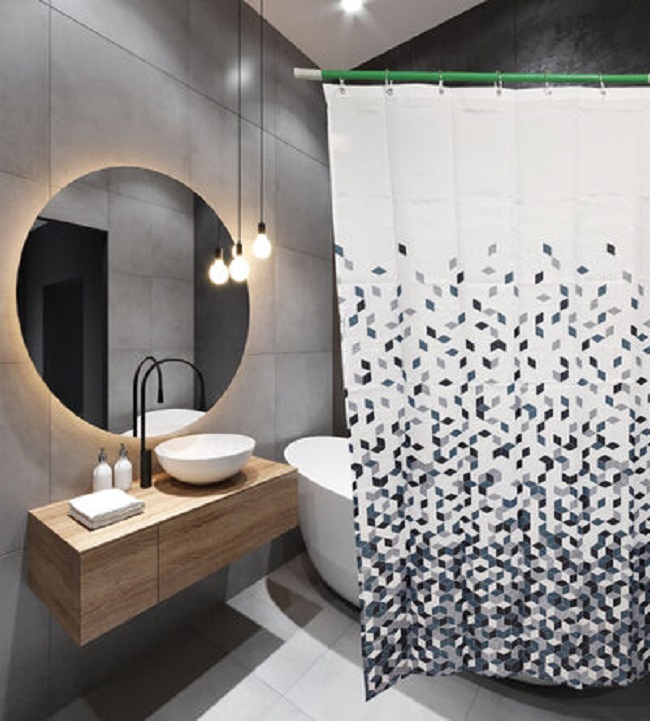 Шторка для ванны изготовлена из текстиля с гидрофобной пропиткой, что делает ее водонепроницаемой. Верхний край усилен двойным загибом с отверстиями для колец.