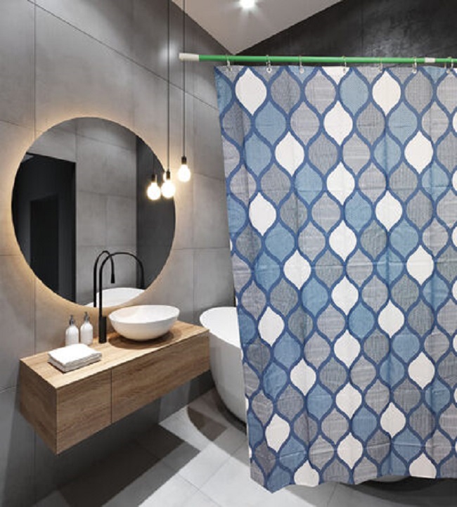 Шторка для ванны изготовлена из текстиля с гидрофобной пропиткой, что делает ее водонепроницаемой. Верхний край усилен двойным загибом с отверстиями для колец.