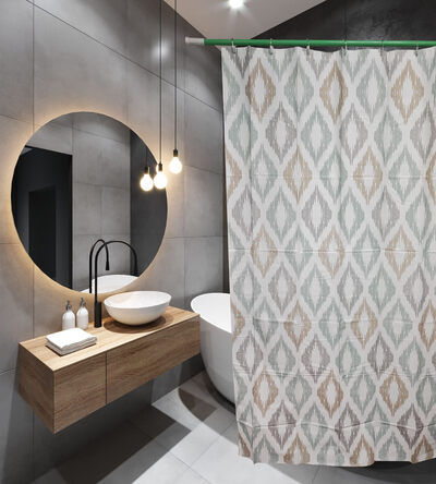 Шторка для ванны изготовлена из текстиля с гидрофобной пропиткой, что делает ее водонепроницаемой. Верхний край усилен двойным загибом с отверстиями для колец.