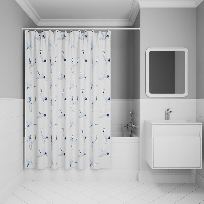 Текстильная штора для ванной черного цвета с белыми акварельными журавлями. Благодаря качественному рисунку штора выглядит элегантно и придаст изысканность любой ванной комнате.