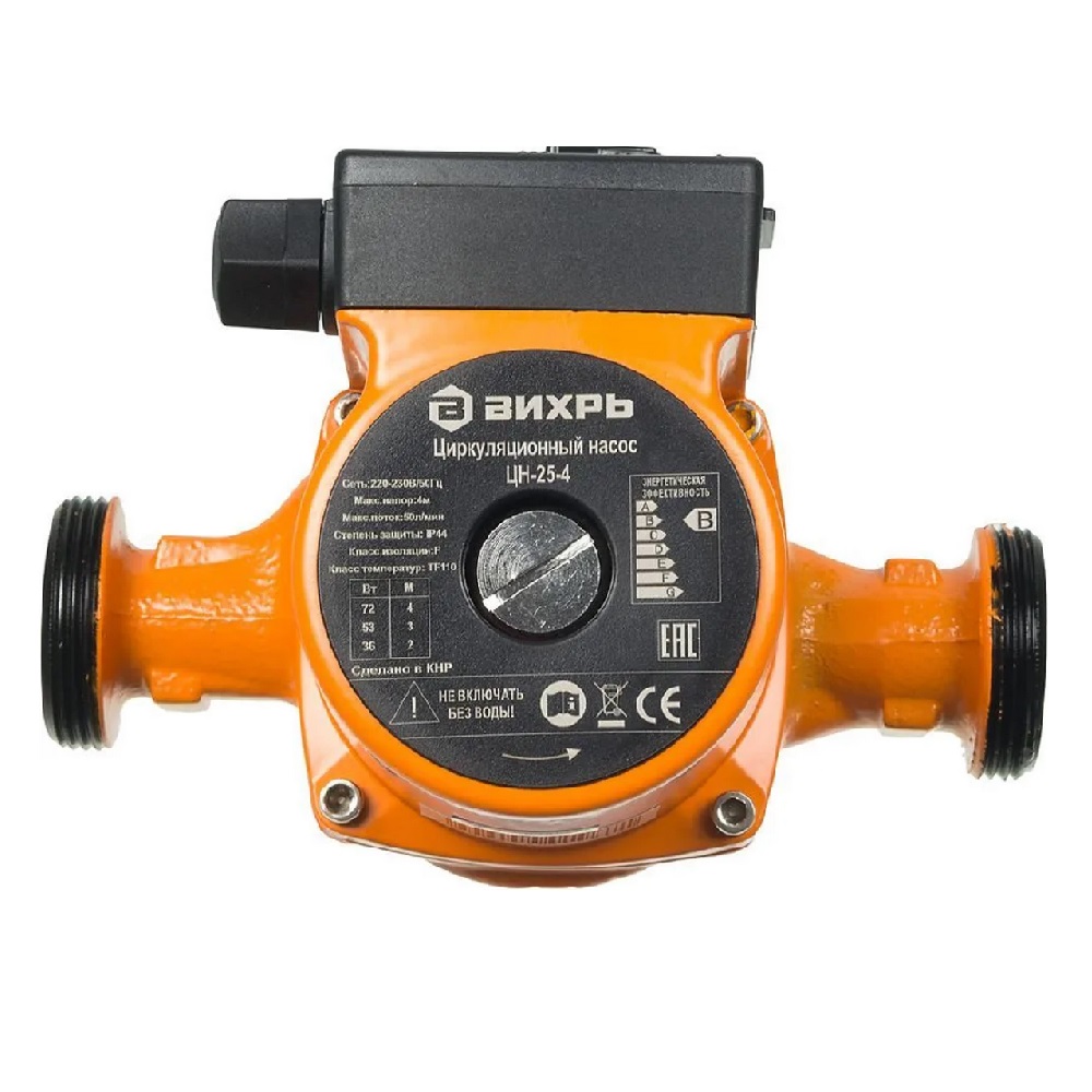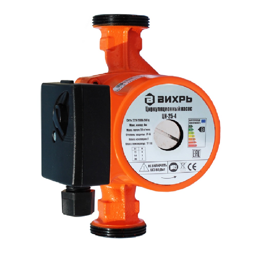Циркуляционный насос Вихрь ЦН-25-4 предназначен для обеспечения циркуляции воды в системах отопления, круговых трубопроводах горячего и холодного водоснабжения, центральных отопительных установках и системах перекачки промышленных вод, системах кондиционирования, охлаждения. Насос представляет собой компактное устройство с всасывающей и нагнетающей функциями, вода перекачивается при помощи вращения рабочего колеса электродвигателем насоса. Насос имеет три скорости работы, выбираемые ручным переключением вращающейся ручки на клеммной коробке. Преимущества ЦН-25-4: установка непосредственно на трубопроводе, маленькие габаритные размеры, быстрая регулировка скорости подачи воды, бесшумная работа.