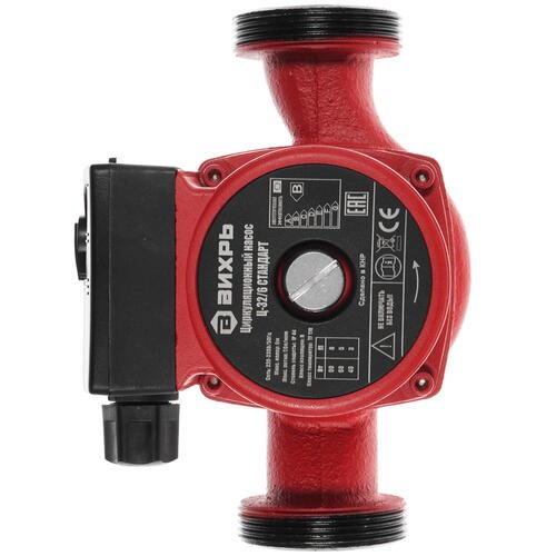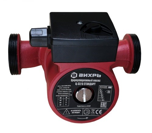 Циркуляционный насос Вихрь Ц-32/6 предназначен для обеспечения циркуляции воды в системах отопления, круговых трубопроводах горячего и холодного водоснабжения, центральных отопительных установках и системах перекачки промышленных вод, системах кондиционирования, охлаждения. Насос представляет собой компактное устройство с всасывающей и нагнетающей функциями, вода перекачивается при помощи вращения рабочего колеса электродвигателем насоса. Насос имеет три скорости работы, выбираемые ручным переключением вращающейся ручки на клеммной коробке.