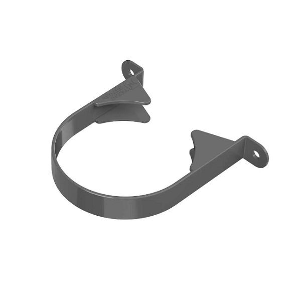 Хомут производится из поливинилхлорида с различными добавками. Элемент не подвержен коррозии и биопоражению, легко очищается и устойчив к воздействию агрессивных факторов окружающей среды. Такой хомут предназначен для крепления водосточной трубы на необходимом от фасада расстоянии.