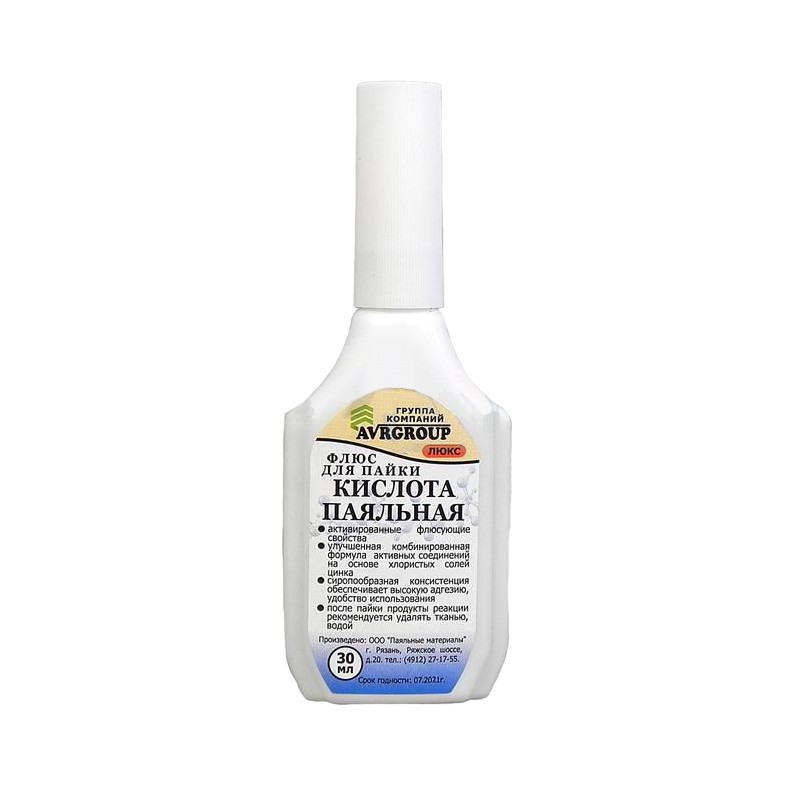 Паяльная кислота REXANT является одним из самых распространенных флюсов для пайки. Предназначена для удаления оксидов с поверхности под пайку и улучшения растекания жидкого припоя при пайке углеродистых и низколегированных сталей, меди, никеля и их сплавов. Применяется при пайке и лужении деталей припоями оловянно-свинцовой. Изготовлена в соответствии с ОСТ 4Г 0.033.200. Температура наибольшей активности: +290...+350°С. После пайки рекомендуется смыть остатки кислоты 5% раствором кальцинированной соды. Высокая проникаемость флюса позволяет легко обработать контакт в самых труднодоступных местах, а агрессивность способствует быстрому разрушению оксидной пленки на поверхности металла. Основные компоненты: хлорид цинка и вода. Вариант фасовки – флакон объемом 30 мл.