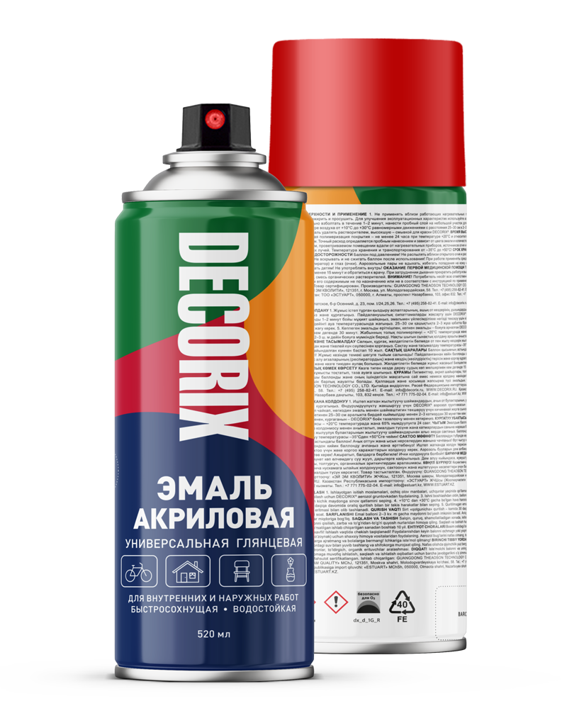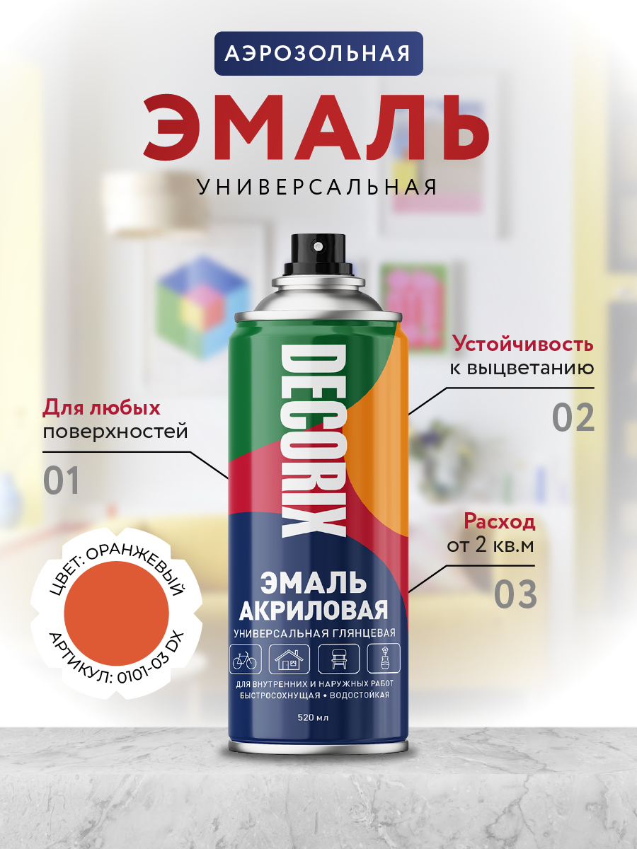 Универсальная акриловая эмаль DECORIX предназначена для бытового применения, декоративно-оформительских работ, строительства и ремонта. Идеально подходит для поверхностей из металла, древесины, бетона, камня, стекла, керамики и некоторых видов пластмасс.