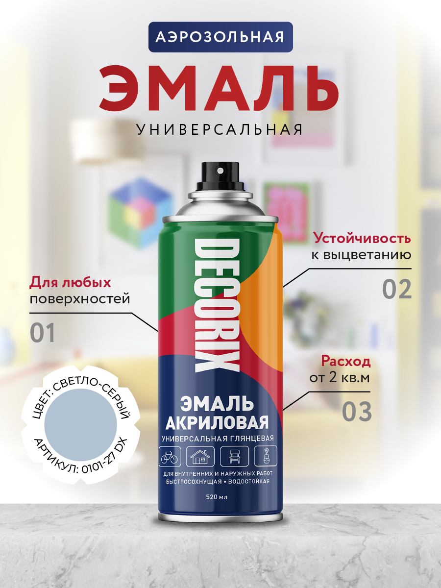 Универсальная акриловая эмаль DECORIX предназначена для бытового применения, декоративно-оформительских работ, строительства и ремонта. Идеально подходит для поверхностей из металла, древесины, бетона, камня, стекла, керамики и некоторых видов пластмасс.