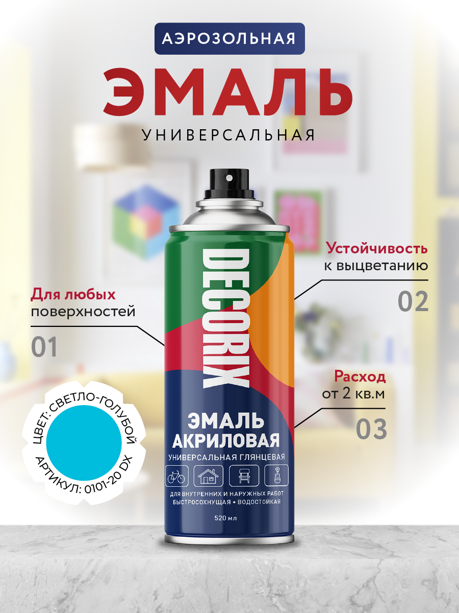 Универсальная акриловая эмаль DECORIX предназначена для бытового применения, декоративно-оформительских работ, строительства и ремонта. Идеально подходит для поверхностей из металла, древесины, бетона, камня, стекла, керамики и некоторых видов пластмасс.