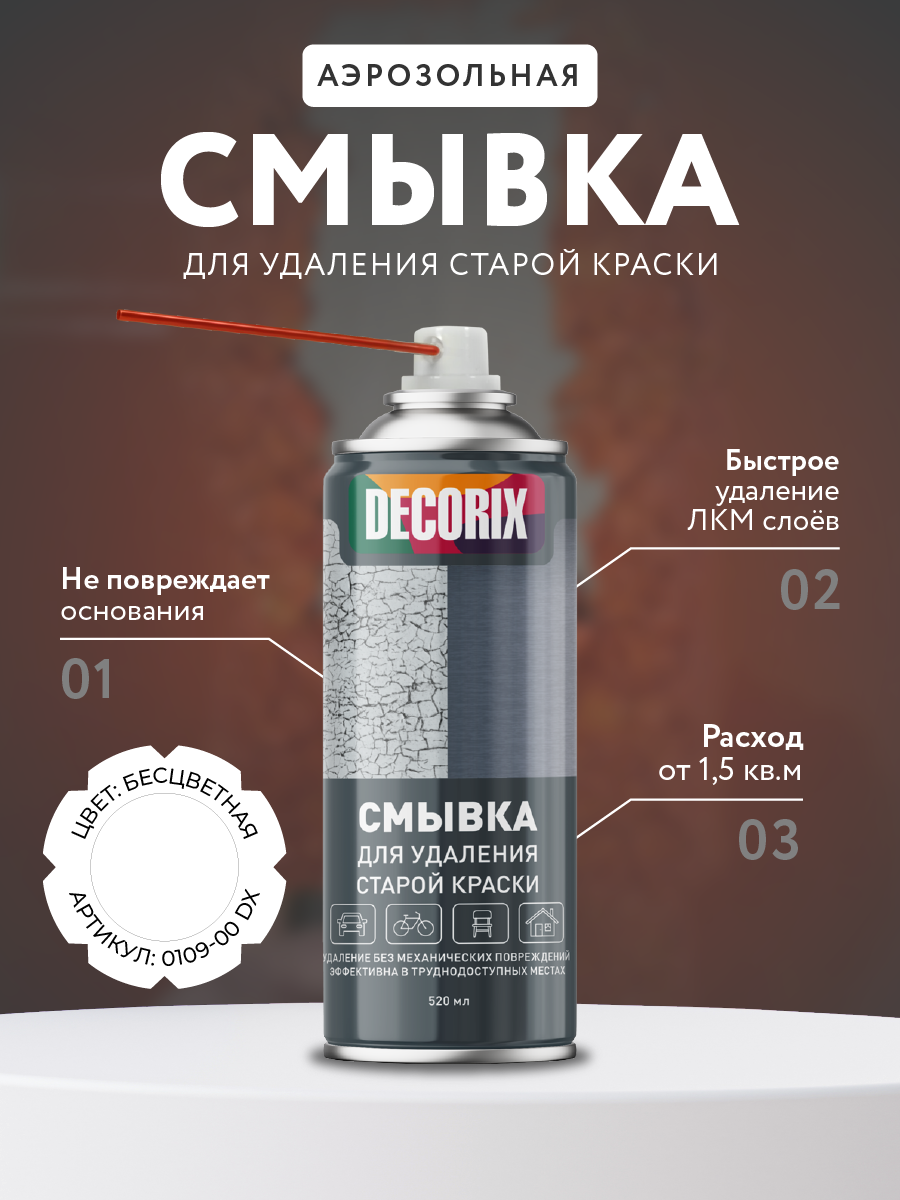Высокоэффективная смывка DECORIX предназначена для быстрого удаления старого лакокрасочного покрытия перед нанесением лака, краски и эмали. В отличии от традиционных механических способов удаления старых покрытий смывка воздействует только на покрытие без риска механического повреждения основания. Смывка эффективно воздействует на алкидные, масленые, нитроцеллюлозные, акриловые и меломиноалкидные покрытия. Аэрозольная смывка удобна для нанесения на труднодоступные поверхности.