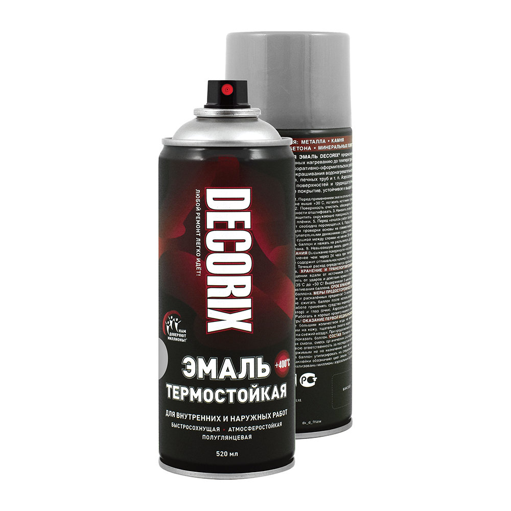 Высококачественная термостойкая эмаль DECORIX предназначена для окрашивания поверхностей, подверженных нагреванию до температуры +400°С. - водонагревательного оборудования, паропроводов и их элементов, печных труб и т.д., а также для бытового применения, декоративно-оформительских работ, строительства и ремонта.