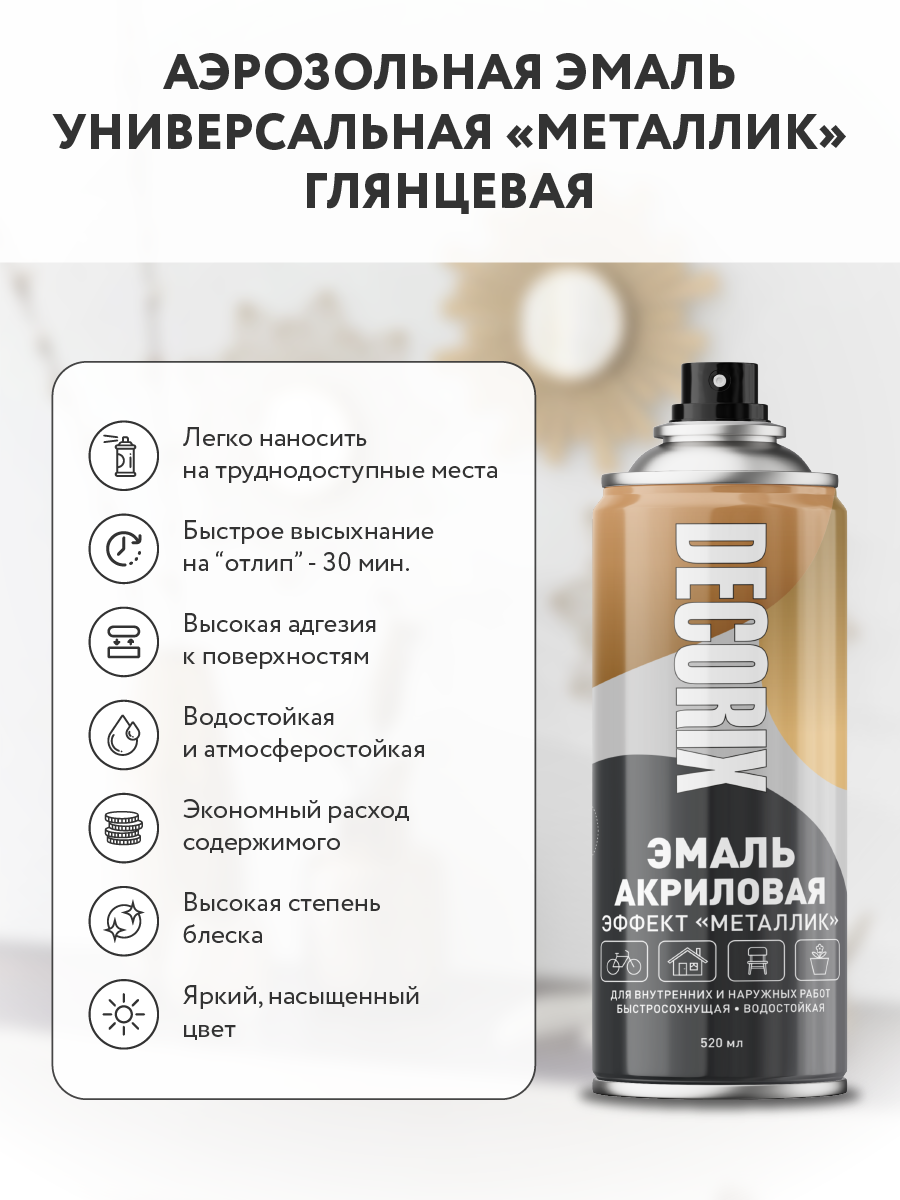 Аэрозольная эмаль Decorix (металлик; глянцевая; акриловая; искрящееся золото; 520 мл) 0103-76 DX используется в декоративно-оформительских работах, строительстве и ремонте. Предназначена для окрашивания: древесины, пластика, металла, бетона, кирпича, керамики, стекла, картона, минеральных поверхностей. Аэрозольная эмаль удобна для окрашивания небольших поверхностей и труднодоступных мест. Образует гладкое, устойчивое к выцветанию покрытие.