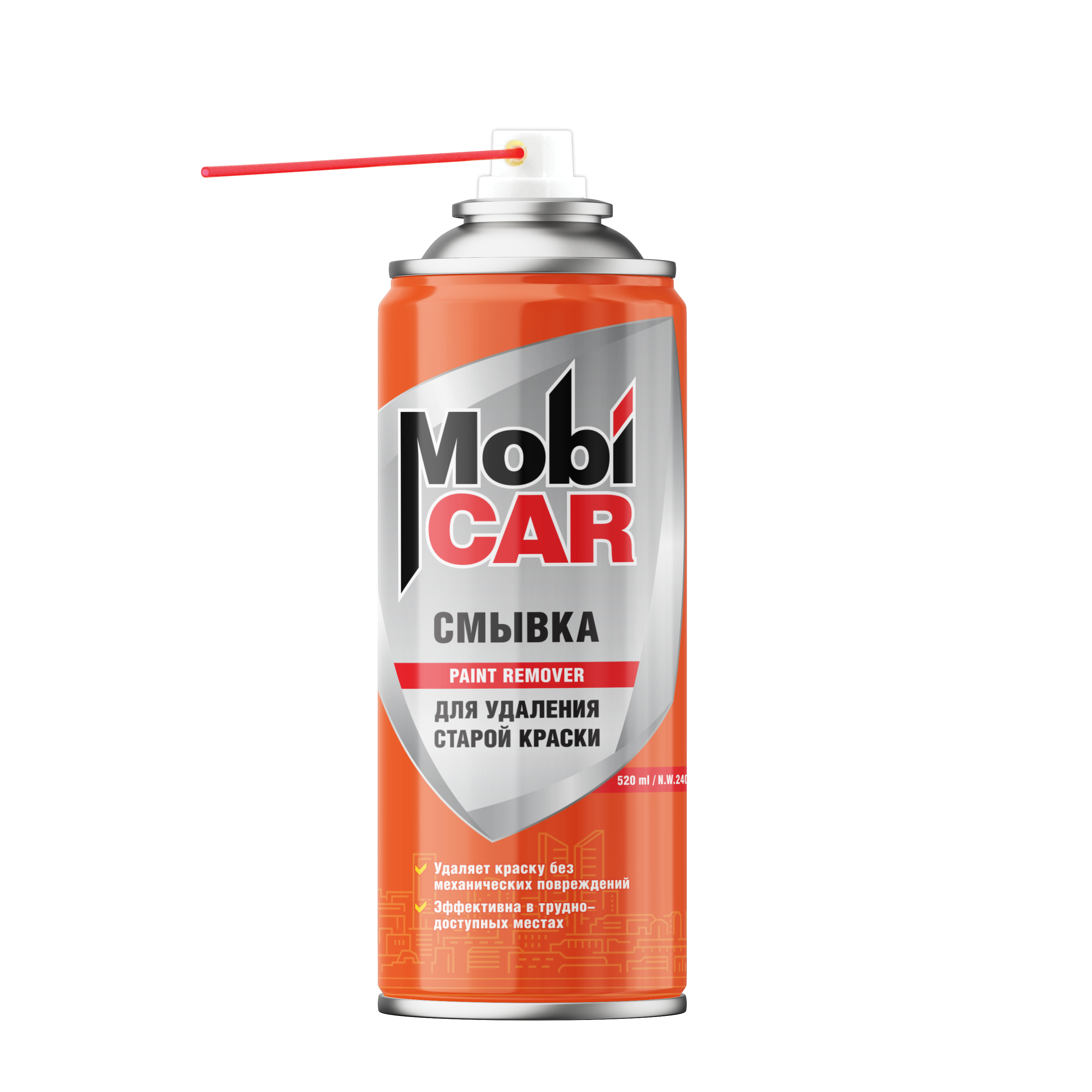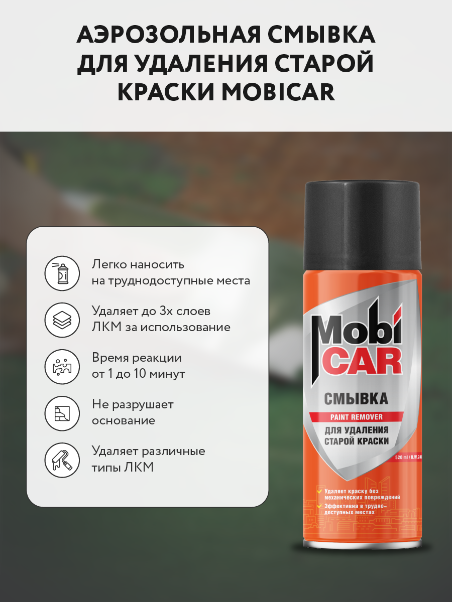 Высокоэффективная смывка MobiCAR® предназначена для быстрого удаления старого лакокрасочного покрытия перед нанесением лака, краски или эмали. В отличие от традиционных механических способов удаления старых покрытий смывка воздействует только на покрытие без риска механического повреждения основания. Смывка эффективно воздействует на алкидные, масляные, нитроцеллюлозные, акриловые и меламиноалкидные покрытия. Аэрозольная смывка удобна для нанесения на труднодоступные поверхности.