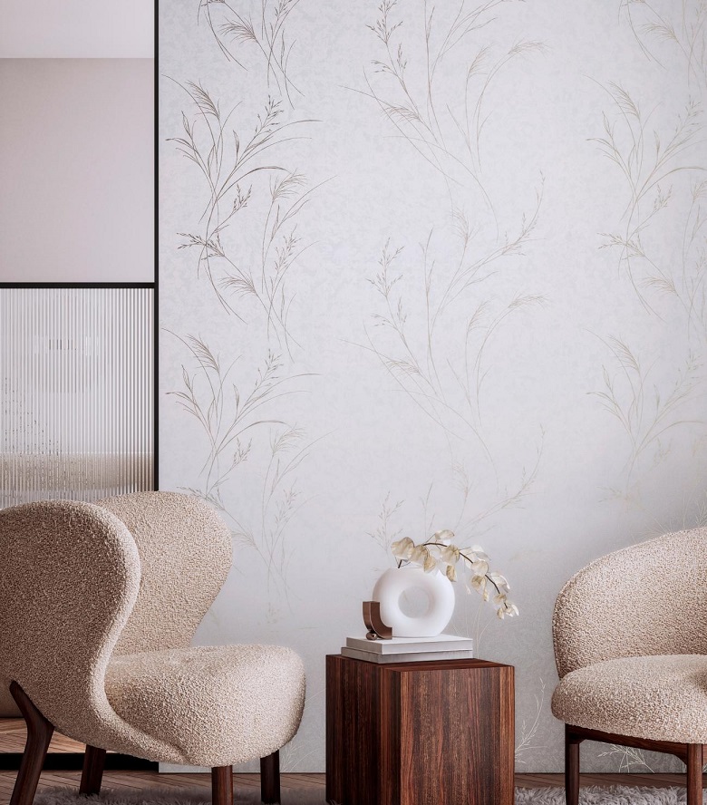 Коллекция Melodia вдохновлена изящными луговыми травами и мягким утренним сиянием солнца. Тонкие вытянутые веточки визуально увеличивают высоту потолков, а деликатные металлизированные линии стеблей добавляют блеска и наполняют интерьер умиротворённостью. Компаньон выполнен с эффектом лаконично мерцающей изнутри штукатурки, что придает стенам глубину и естественное сияние. Такой декоративный приём делает интерьер сложнее и изысканнее, сохраняя при этом лёгкость его восприятия.