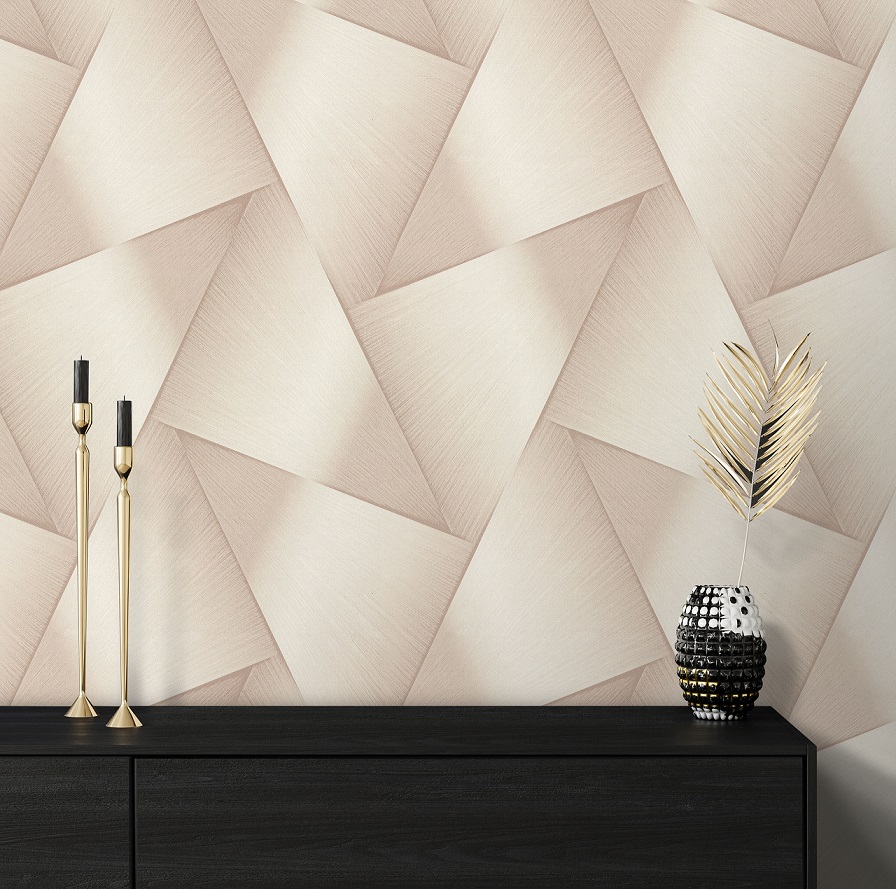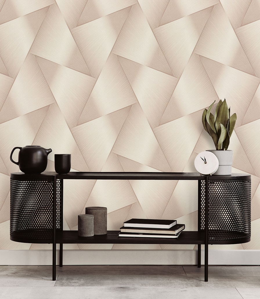 Основой дизайна коллекции служит крупный геометрический узор, построенный из треугольников, линий и многогранных фигур, которые пересекаются и создают сложную, почти архитектурную структуру. Грани узора будто «играют» с пространством, создавая эффект трехмерности, а треугольники превращаются в сверкающие кристаллы или драгоценные камни, переливающиеся на свету всеми оттенками палитры. Фактура, имитирующая бетон, придает полотнам урбанистический шик и индустриальную современность.