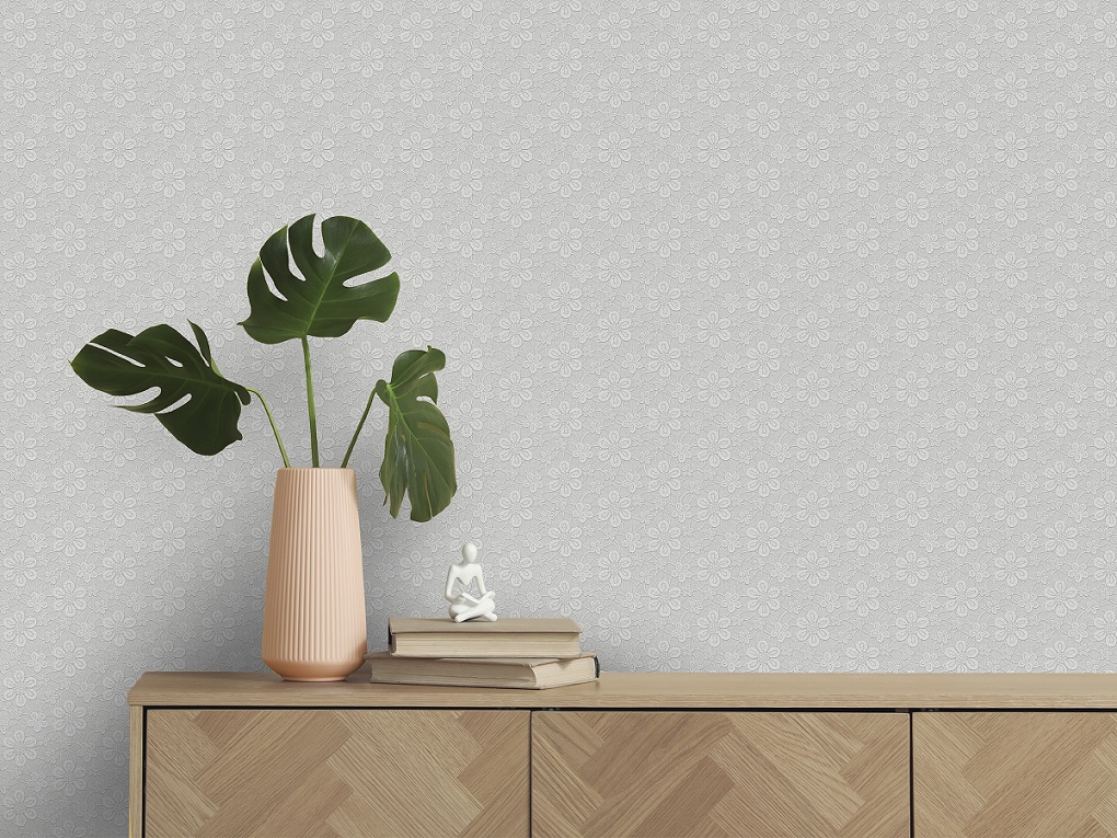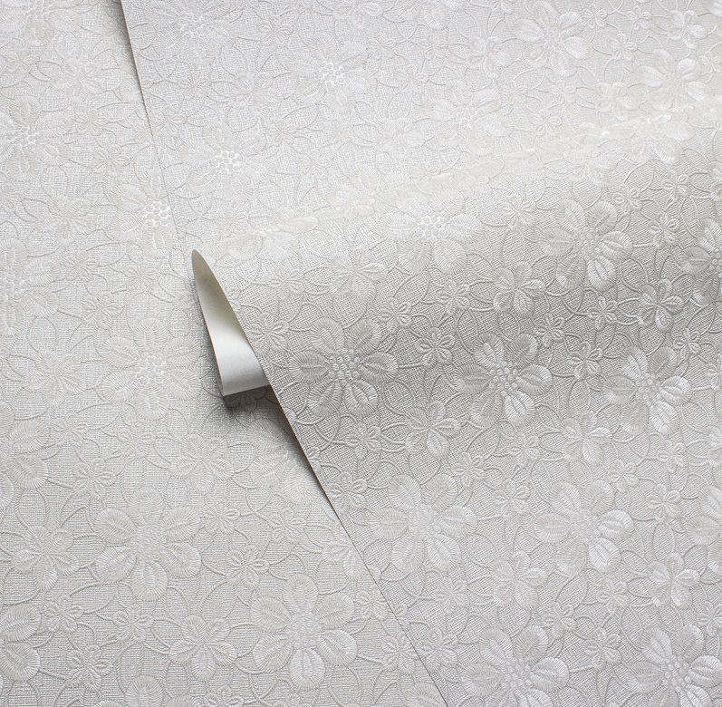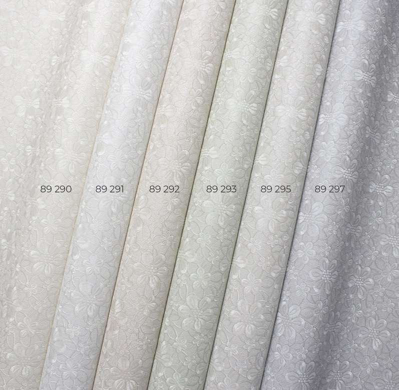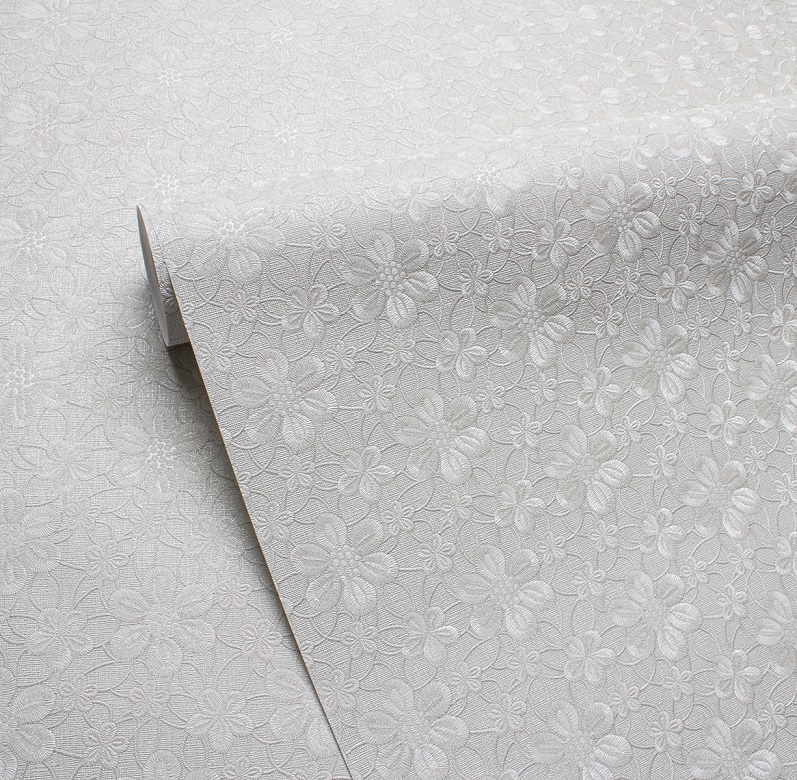 Равномерный кружевной узор отражает современный хэндмэйд-тренд и выполнен с кропотливой тщательностью: тиснение было создано полностью вручную гравером, что делает каждую деталь уникальной. Основу дизайна составляет изысканное кружево ручной работы, украшенное тонкими цветочными мотивами. Нежная пастельная палитра с легким перламутровым отблеском наполняет пространство светом и воздушностью.