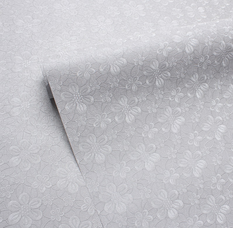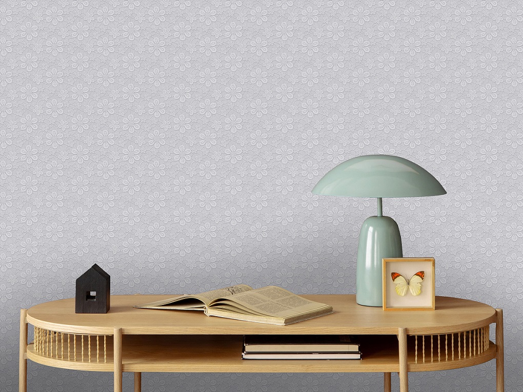 Равномерный кружевной узор отражает современный хэндмэйд-тренд и выполнен с кропотливой тщательностью: тиснение было создано полностью вручную гравером, что делает каждую деталь уникальной. Основу дизайна составляет изысканное кружево ручной работы, украшенное тонкими цветочными мотивами. Нежная пастельная палитра с легким перламутровым отблеском наполняет пространство светом и воздушностью.