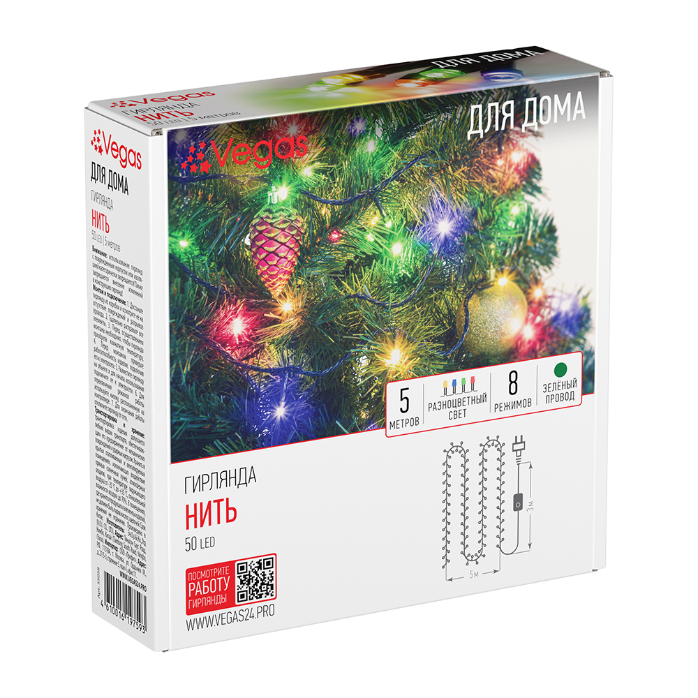 Длина гирлянды 5 м, длина провода 5 м, количество светодиодов 50. Цвет свечения многоцветный, цвет провода зеленый. Степень защиты IP 20. Мощность 3 W. Гирлянда имеет контроллер (8 режимов работы). Использовать при комнатной температуре. Срок службы 25 000 часов.