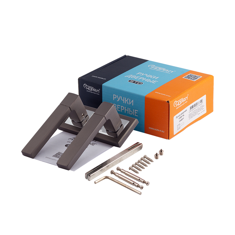 В комплекте с ручкой поставляется разрезной соединительный квадрат, имеющий длину 100мм и сечении 8х8мм, шурупы для крепежа ручки на дверном полотне, соединительные стяжные винты, а также дополнительные винты для фиксации ручек