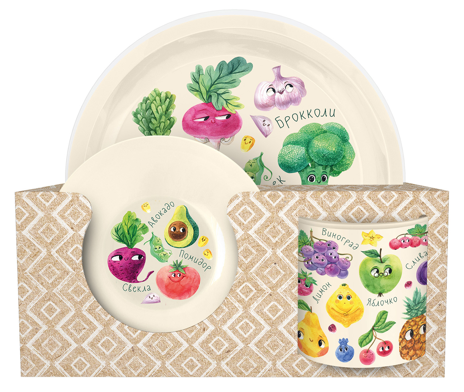 Набор посуды пласт. тарелка D215мм, миска D130мм, кружка 280мл с декором светло-бежевый 2211