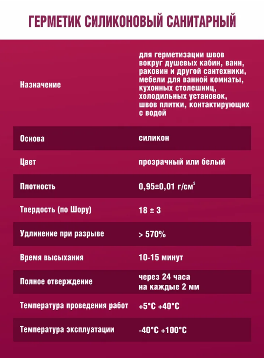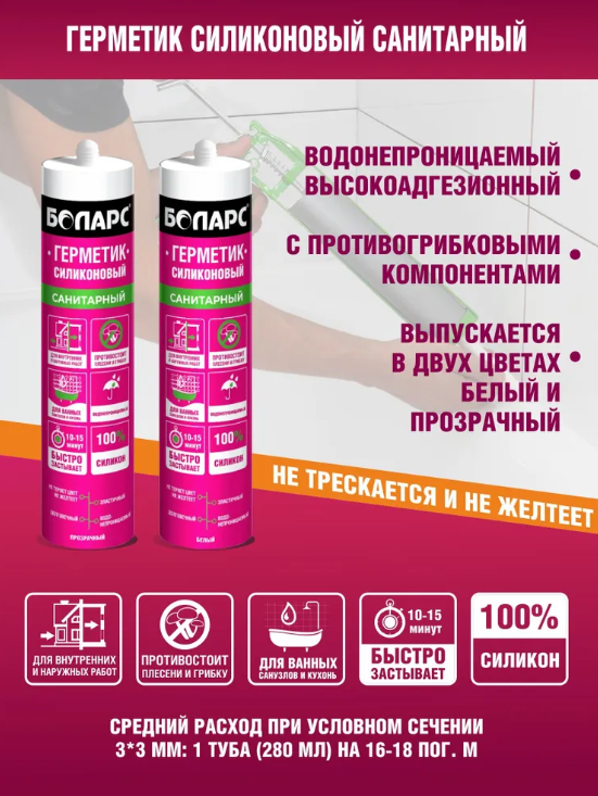 Высокоадгезионный силиконовый герметик для надежной герметизации швов вокруг душевых кабин, ванн, раковин и другой сантехники, мебели для ванной комнаты, кухонных столешниц, холодильных установок, швов плитки, контактирующих с водой. Специальная формула для влажных помещений и зон с повышенным образованием конденсата. Содержит противогрибковые компоненты для предотвращения роста плесени. Устойчив к УФ-излучению, не трескается и не теряет цвет при старении даже во влажной среде. Быстро затвердевает и становится водонепроницаемым в течение нескольких часов. Не подлежит окрашиванию.