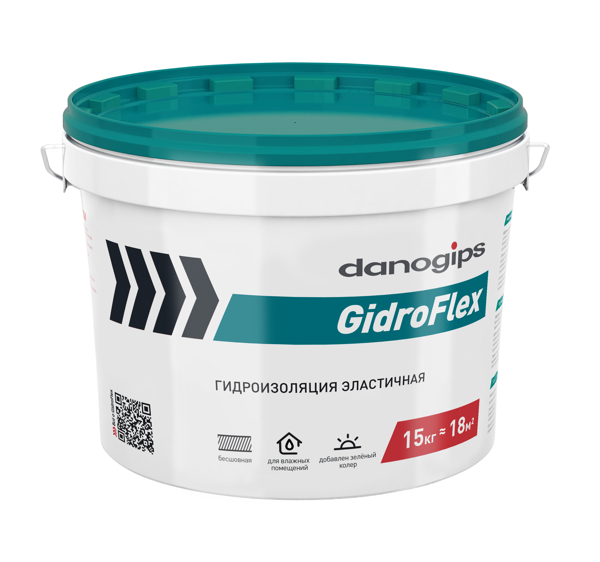 Гидроизоляция Danogips GidroFlex (Даногипс ГидроФлекс) – готовая к применению бесшовная эластичная гидроизоляция для стеновых и напольных поверхностей во влажных и мокрых помещениях. После высыхания поверхность пригодна под укладку облицовочных материалов, таких как керамическая плитка, керамогранит и т.п. Предназначена для работы на объектах, подвергающихся нагрузке водой; для обработки гипсокартонных и гипсоволокнистых листов, цементных и гипсовых штукатурок, гипсовых пазогребневых плит, цементных и гипсовых стяжек, древесноволокнистых плит и ЦСП, пено- газобетонных блоков, бетонных и железобетонных поверхностей, полов с подогревом, душевых (в т.ч без поддонов), ванных комнат, санузлов, кухонь и крытых балконов.
