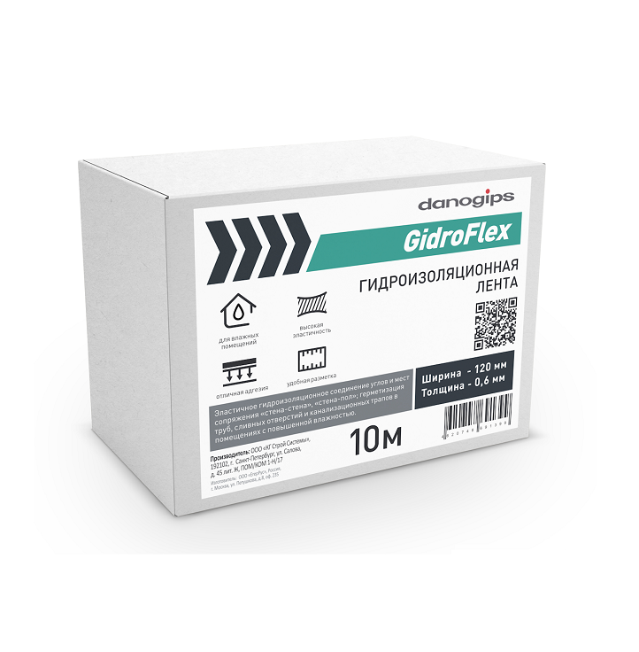 Гидроизоляционная лента Danogips GidroFlex — это эластичная лента, предназначенная для: гидроизоляционного соединения углов и мест сопряжения «стена-стена», «стена-пол»; герметизации труб, сливных отверстий и канализационных трапов в помещениях с повышенной влажностью.