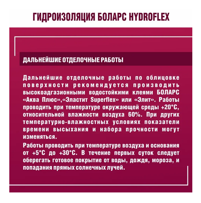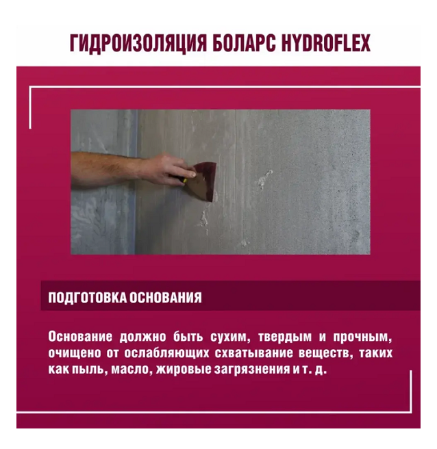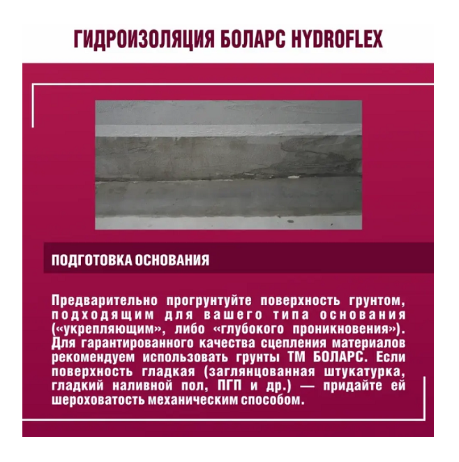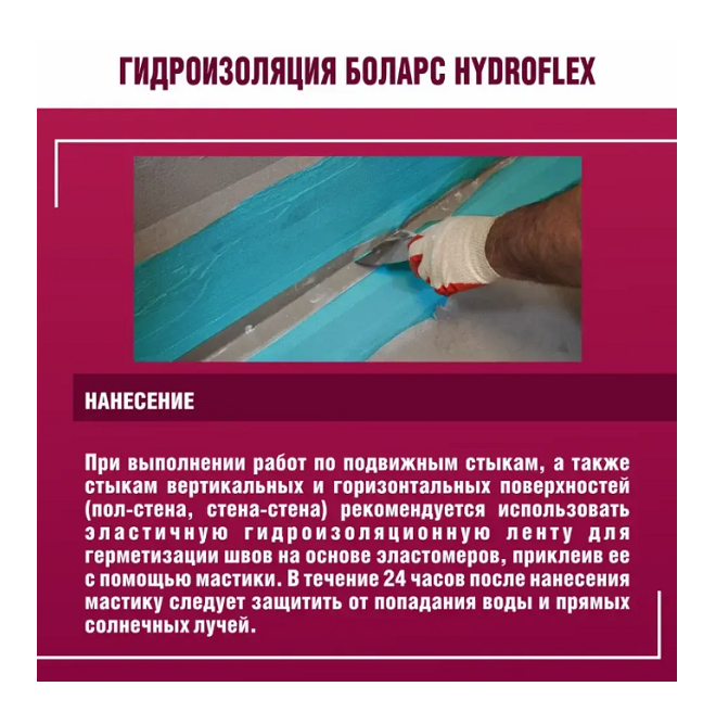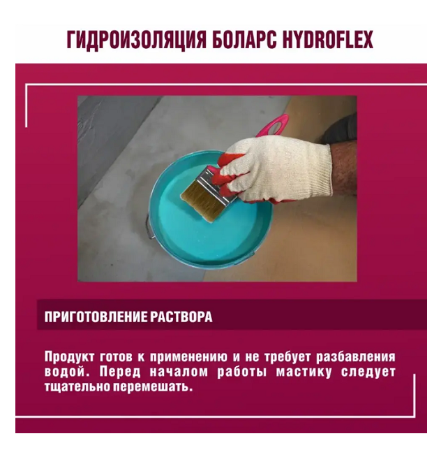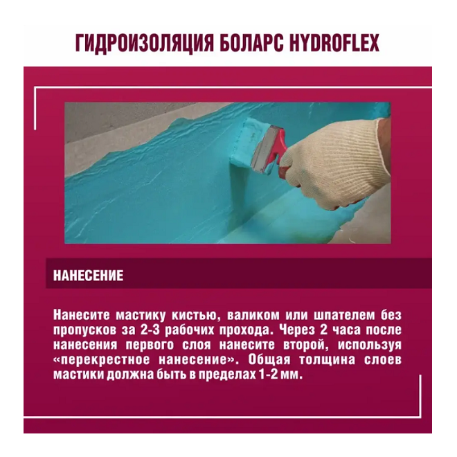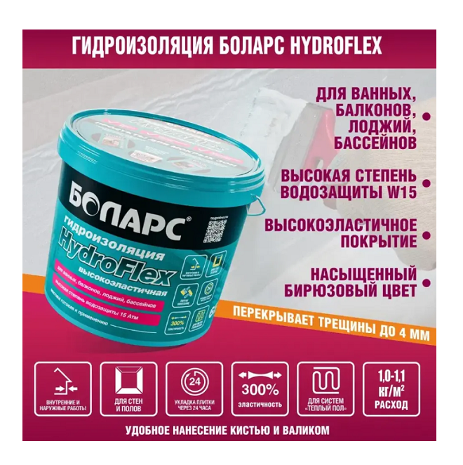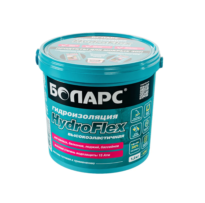 Гидроизоляционная мастика БОЛАРС «HydroFlex» предназначена для устройства бесшовной гидроизоляции стен, полов и рабочих поверхностей во влажных помещениях (кухни, ванные комнаты, душевые кабины, прачечные, балконы) перед облицовкой керамической плиткой. Для защиты оснований из бетона, кирпича, пенобетона, каменных и керамических кладок, цементно-песчаных штукатурок, в том числе для защиты чувствительных к влаге оснований: гипсовых штукатурок и полов, гипсокартонных и гипсоволокнистых листов, пазогребневых плит и блоков. Используется в системах «теплый пол».
